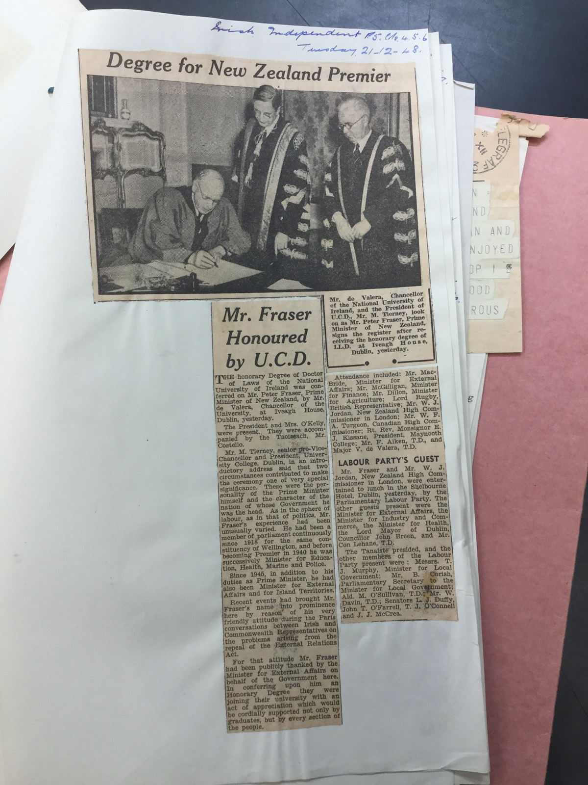 As well as telling the story about the ‘Sons of Eire’ , the book also highlights the close relationship that developed between Eamon de Valera and Peter Fraser. It documents their four meetings in 1935, 1941 and twice in 1948. The decision to allow the Irishmen to stay in New Zealand was largely due to Peter Fraser’s relationship with, and support for, the Irish and his strong friendship with Eamon de Valera.